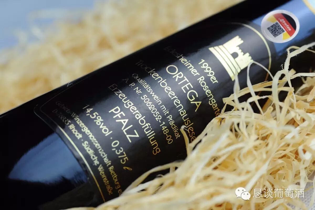 第五级就是咱们这次要说的重点了,就是贵腐王酒这个级别Trockenbeerenauslese,简称TBA,这要等到葡萄基本干枯了才进行采摘,由于很难进行正常的发酵,所以酒精度不超过6度,并且需要陈年10年以上。价格当然也是天价,世界上最贵的白葡萄酒“伊贡-米勒(Egon Muller)干浆精选”就属于此类,可译为“干浆精选级”。在这个级别上,德国的恳谈公司基本垄断了相关产区了贵腐王酒,在2012年起,被恳谈公司推介到国内的有1989年产的一款贵腐王酒,和1999年产的两款贵腐王酒,都来自德国的法尔茨产区,其品种都是在德国一度非常流行的奥特加。