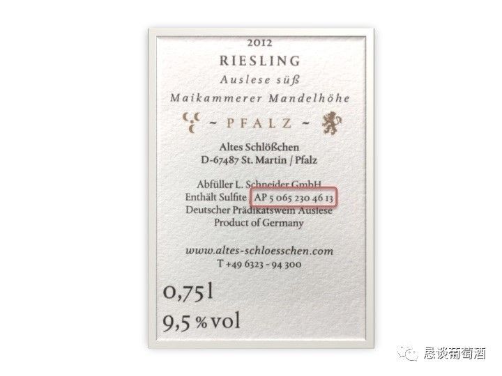 从2006年起,在酿酒过程中使用硫,需要标明‘Enthält Sulfite(含硫)’(为什么会用到硫,请大家参看历史文章<解惑系列 之 二氧化硫是个什么鬼>)。